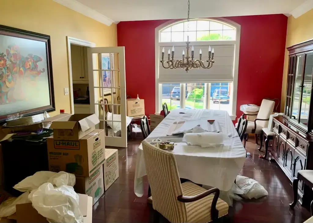 The transformation was immediate. The foyer now feels open and welcoming, with crisp walls that reflect natural light and highlight the home’s trim and architectural details. The dining room, once dominated by deep red, now offers a timeless and move-ready finish that complements the flooring and lighting rather than competing with it.