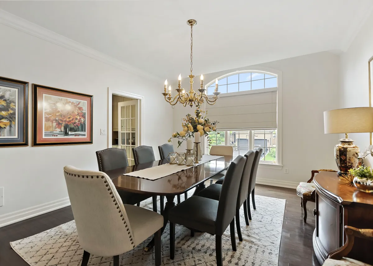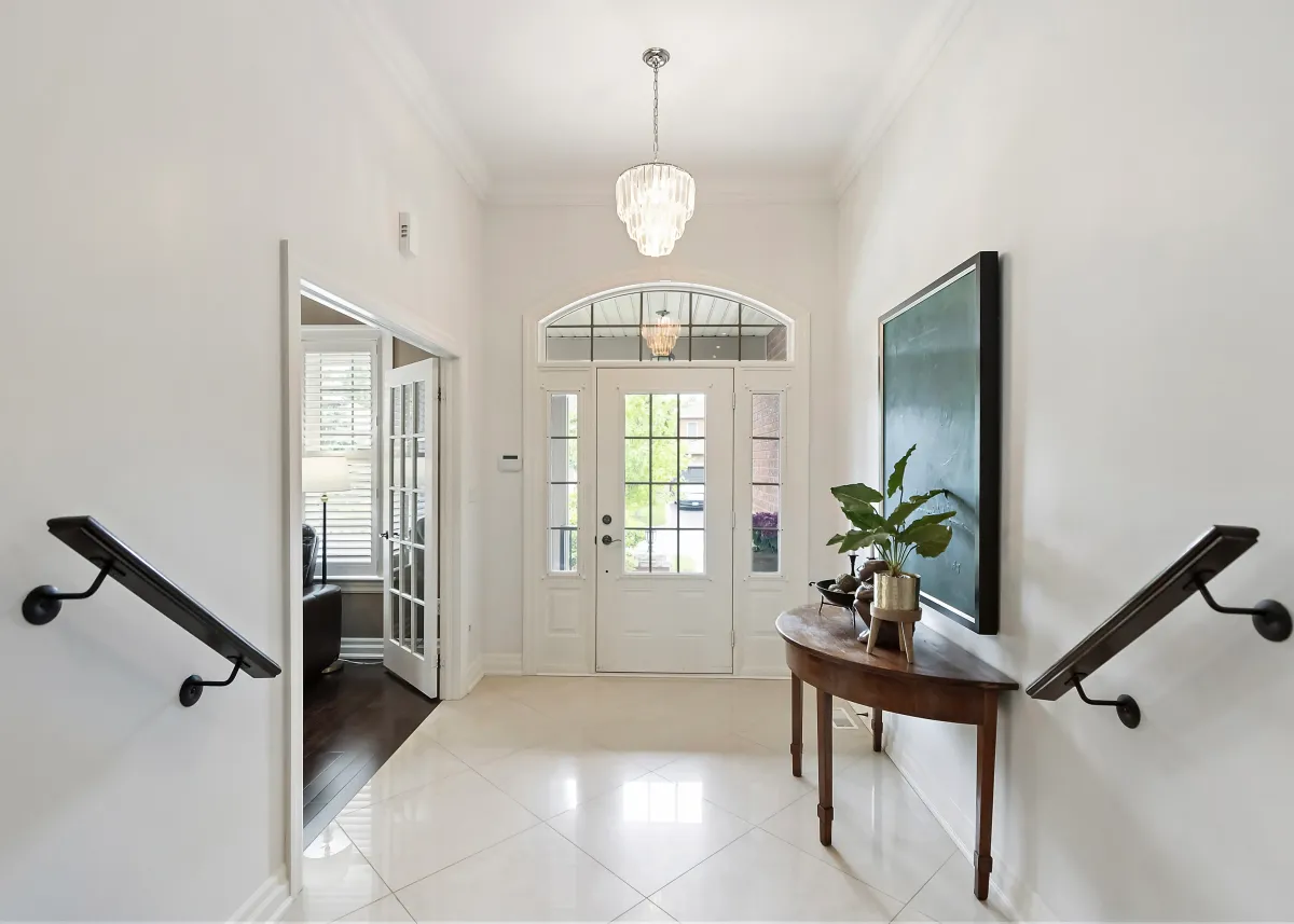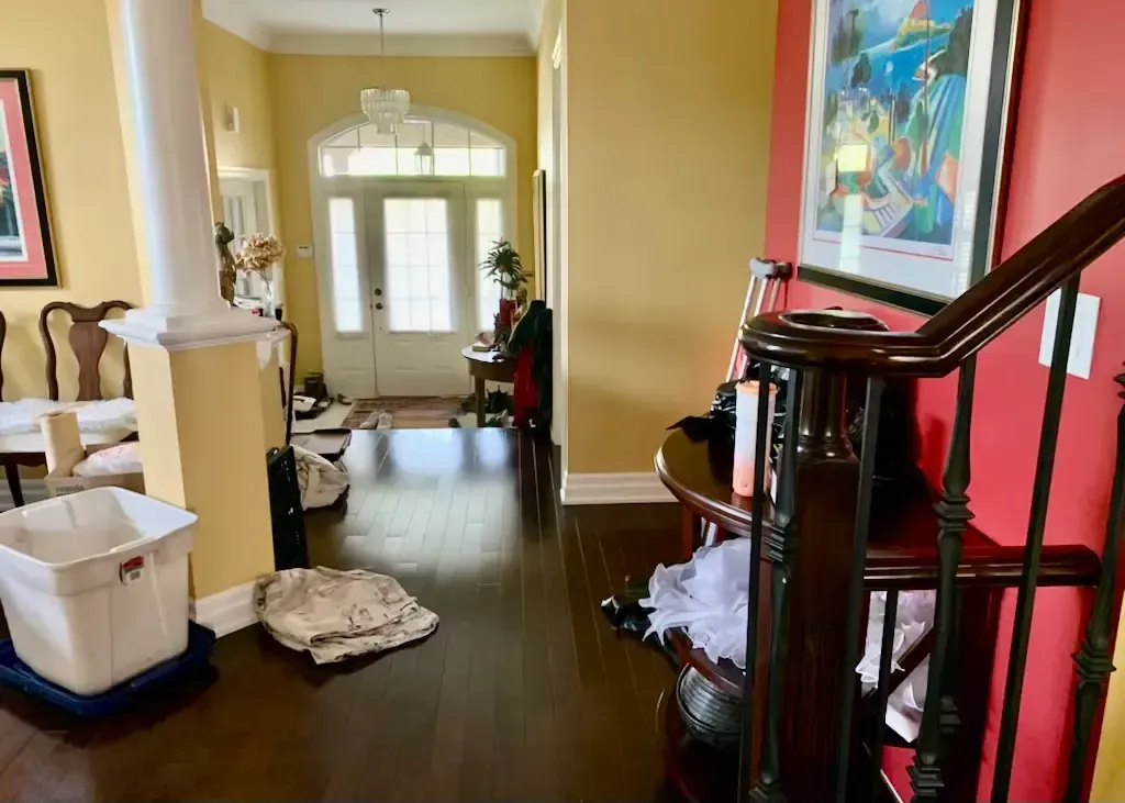 This Port Hope home featured bold yellow and deep red walls throughout the main floor, creating a darker, dated feel across the entryway, dining room, and primary living spaces. While the layout had great architectural features and strong natural light, the heavy colour transitions made the home feel compartmentalized and visually busy.