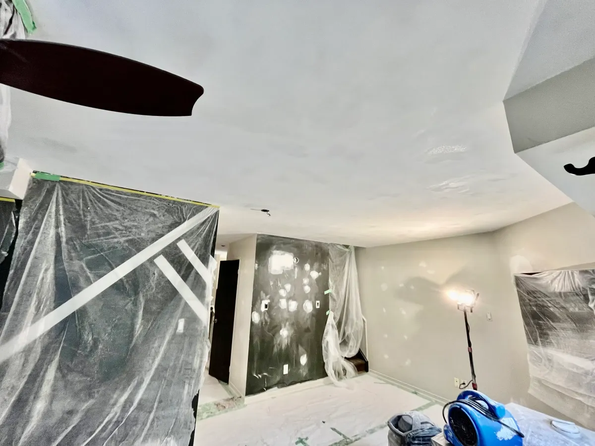 Our team fully protected flooring and furnishings using sealed containment and floor covering systems. The textured ceilings were carefully removed, followed by skim-coating, sanding, and detailed surface preparation to achieve a smooth finish. Walls were repaired where needed, and the entire main floor was repainted in fresh, neutral tones.